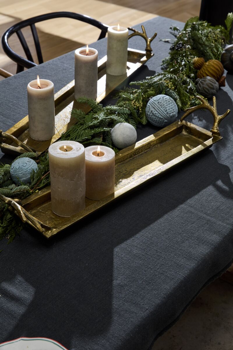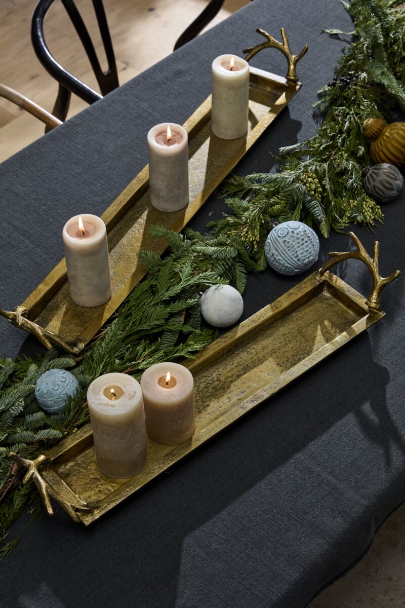 Display pillar candles, taper holders, botanical accents, or curated holiday décor to create a welcoming focal point on coffee tables, entry consoles, dining tables, or mantles. Its metallic finish reflects candlelight beautifully, adding a soft, inviting glow to any setting.