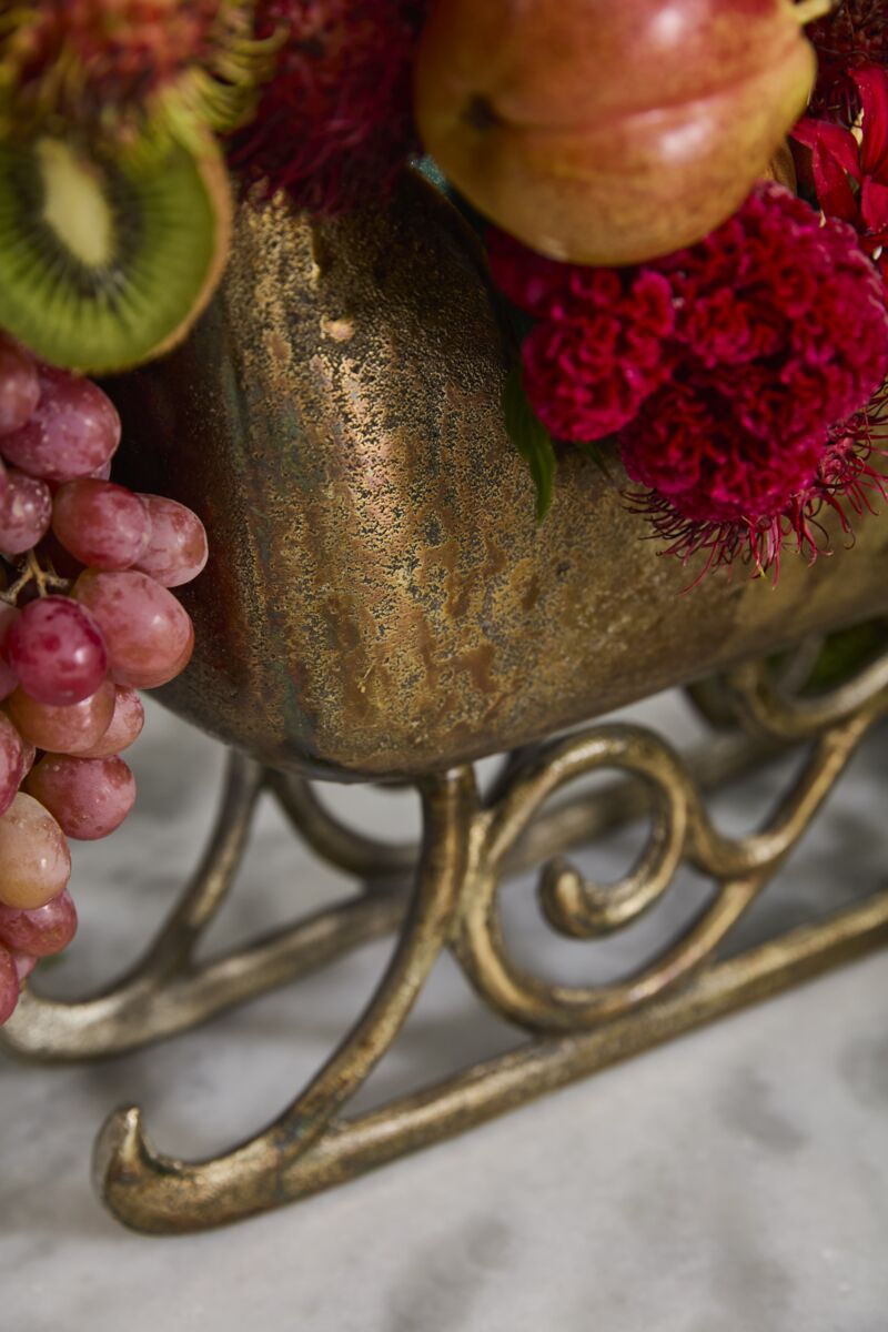 Bring timeless seasonal charm into your home with the Golden Holiday Sleigh Planter. Crafted from cast aluminum with a warm antique gold finish, this decorative sleigh features graceful scrolling base details and a roomy interior that makes styling effortless. Use it to display ornaments, fresh greenery, seasonal florals, or a small tabletop tree. Its classic, heirloom-inspired design adds a festive touch to dining tables, entry consoles, mantels, and coffee tables alike.